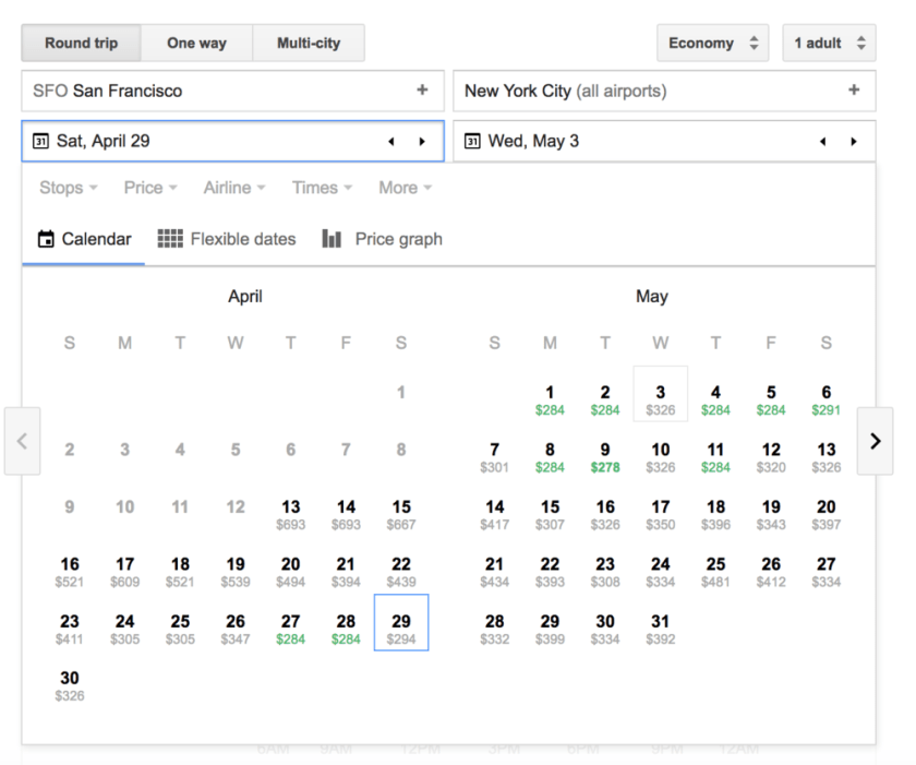 With flexible dates, you can see flexible departure and return dates all at once for a destination. Here’s the view for a trip between San Francisco and Boston in late April or early May. Don’t leave on April 30 – those flights are expensive!