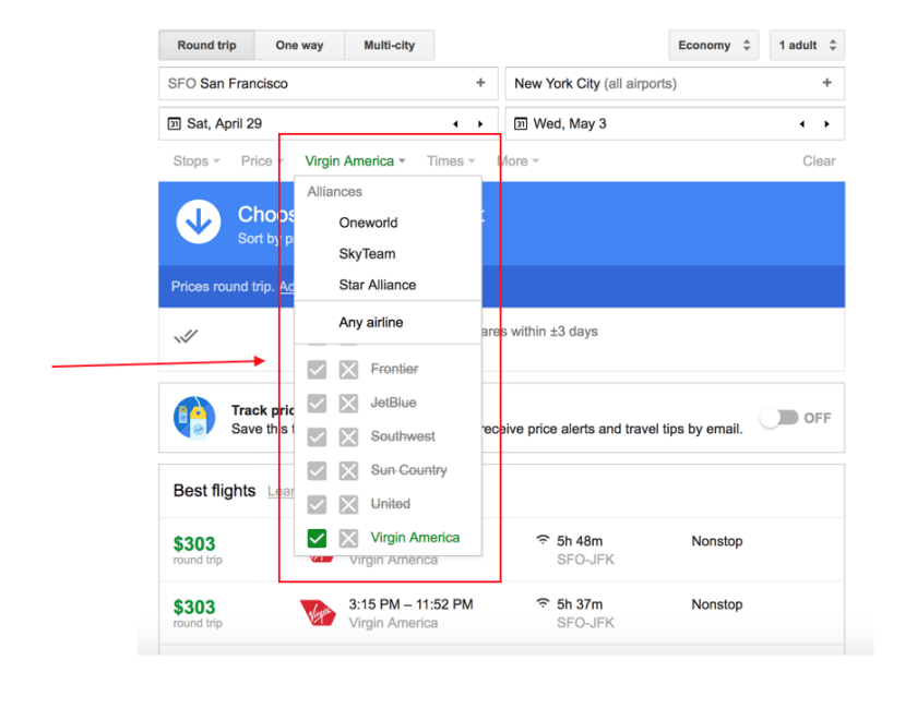 To narrow down your list of airlines (since no one wants to fly United right now), simply click on the ‘Airline’ drop down and select your choice. As you can see, there are other filters as well, such as price and number of stops, which are pretty self-explanatory.
