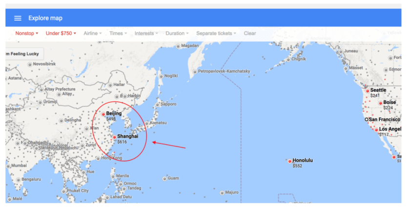 Let me give another example to show the power of this capability. Let’s say I want to take an international trip, but I’m on a tight budget. I really want to visit Asia, but I only have a flight budget of $750. Where can I go from San Francisco? I put in the flight origin, dates, and filters in the map, and in a matter of seconds, I can see a trip to Shanghai for only $612 and Beijing for less than $500!